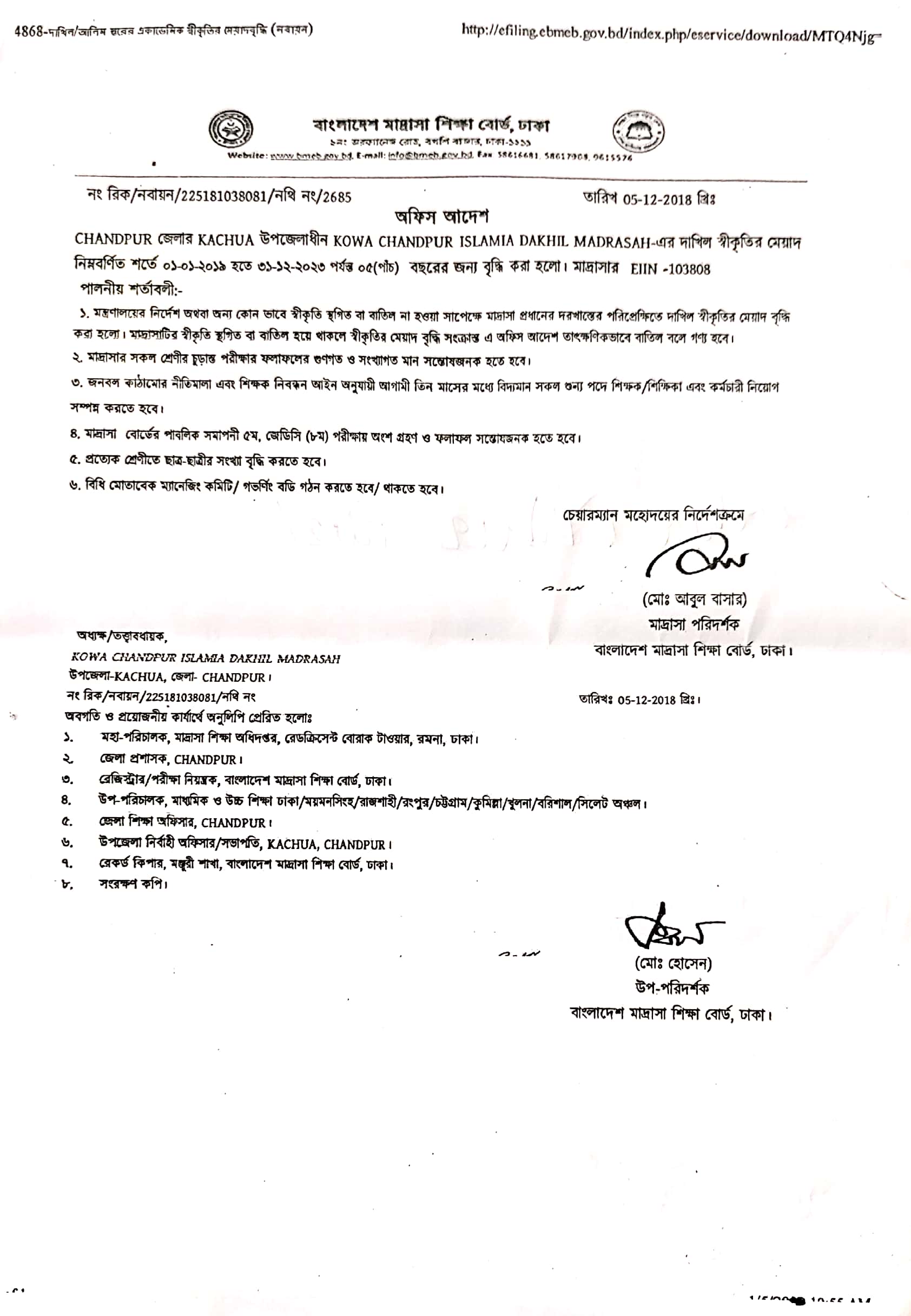 মাদ্রাসার স্বীকৃতি পত্র ২০১৯-২৩